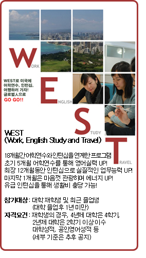 우리 대학생들이 미국에서 최장 18개월간 체류하면서 어학연수와 전문분야 인턴도 하고, 여행도 할 수 있는 ‘한·미 대학생 연수취업(WEST : Work, English Study and Travel)’ 프로그램이 2009년부터 시행됩니다.